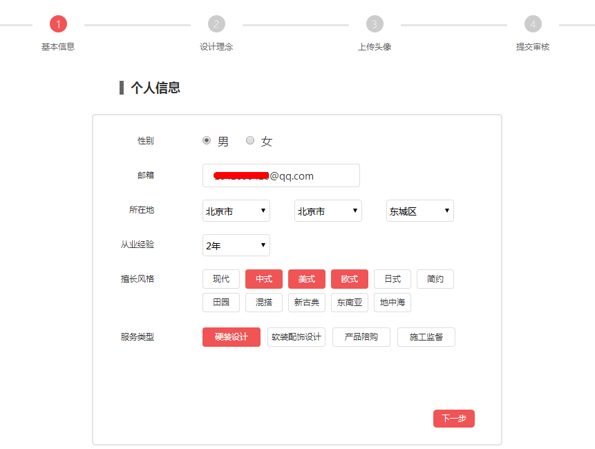 1.3). 填寫(xiě)個(gè)人信息后點(diǎn)擊下一步。(注:基本信息擅長(zhǎng)風(fēng)格選擇不要超過(guò)3個(gè)。)