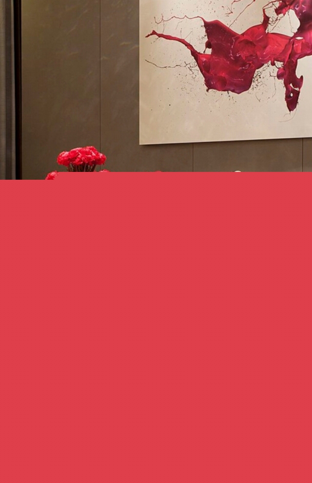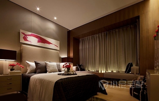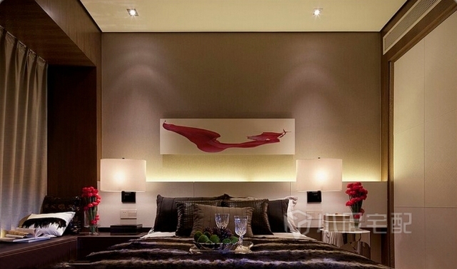由于空間相對(duì)簡約,色彩上就要跳躍出來,以打破單調(diào)之感。本案的主色調(diào)選用咖啡色,較為低調(diào),此時(shí)采用鮮艷的粉紅、大紅配飾就與主色調(diào)形成對(duì)比,造成了強(qiáng)烈的視覺沖擊力,色彩靈動(dòng)大膽。裝飾畫的線條流暢恣意,給人不受拘束自由奔放的感覺;嬌艷的紅色玫瑰配合玻璃花瓶更是讓人眼前一亮。