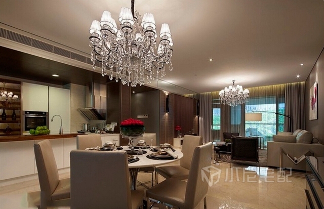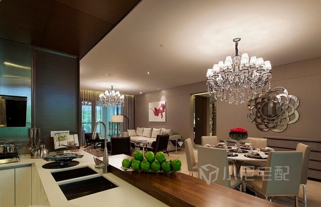 本案在空間構(gòu)造方面可謂深得現(xiàn)代簡約風(fēng)格的精髓,布局設(shè)置簡明獨(dú)立、線條明快、節(jié)奏緊湊??蛷d、餐廳、廚房之間相互聯(lián)通,形成寬敞通透的視覺效果,給人大氣開闊之感。