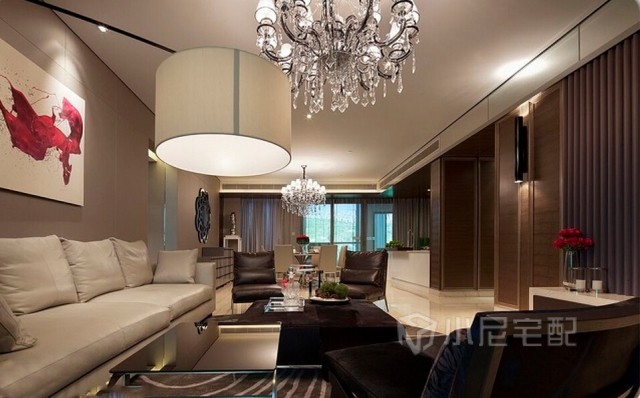客廳的設(shè)計(jì)簡約而不簡單。沒有復(fù)雜的頂棚和繁復(fù)的紋飾,客廳整體線條簡單,以咖啡色、棕色、米色為主,給人沉靜安逸的感受,略顯華麗的燈飾帶來一絲富貴氣息,也使空間飽滿起來。