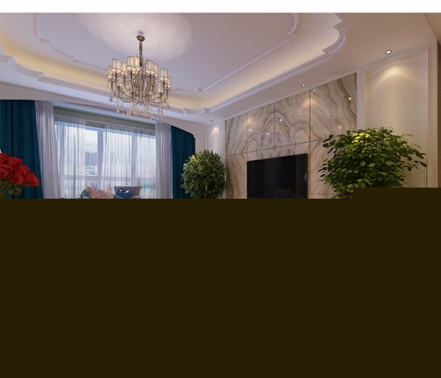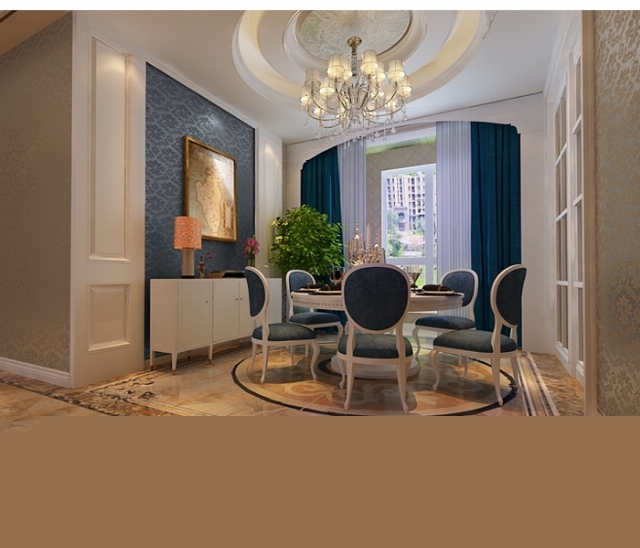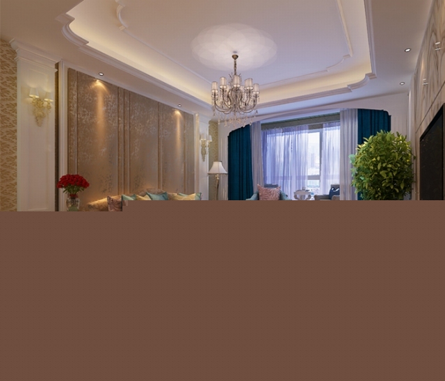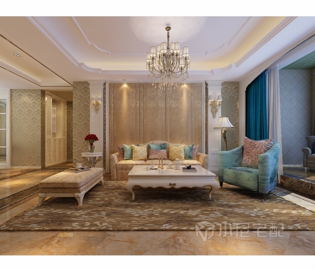 客廳藍色窗簾和水晶燈的搭配讓整體色調清爽一些。