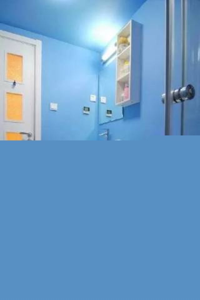 衛(wèi)生間的墻壁是藍(lán)色的,顯得干凈整潔一些,洗手池上方還有一個放置洗漱用品的小架子,物品的拿取非常方便奧。