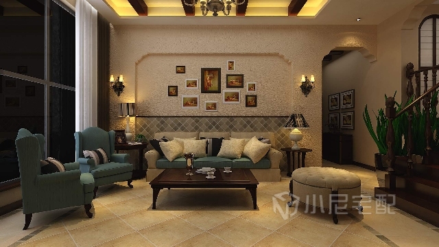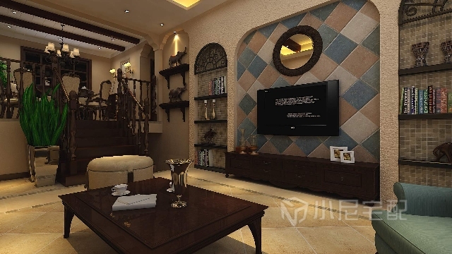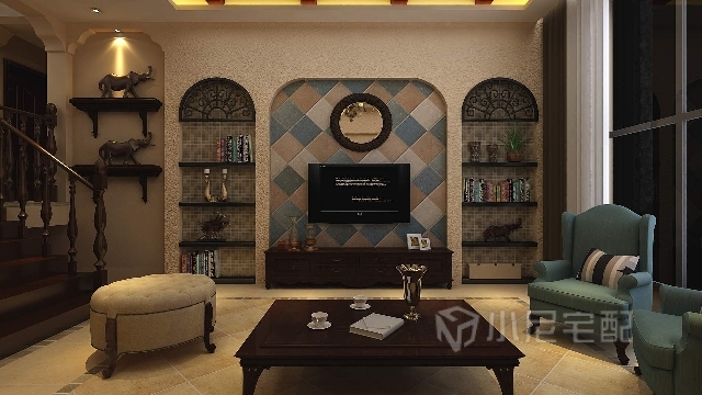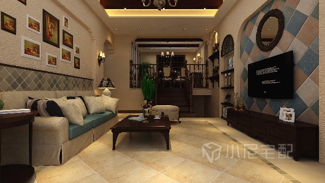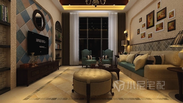 客廳 電視背景墻用藍(lán)、白、粉三色拼接而成,藍(lán)色的沙發(fā)墊巧妙呼應(yīng),