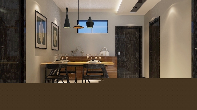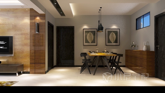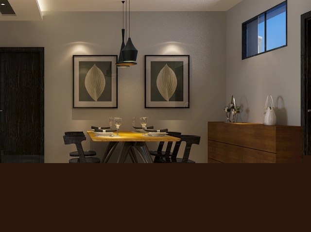 餐邊柜繼續(xù)保持木色和對(duì)稱和整體風(fēng)格一致,而稍富有變化的餐桌和時(shí)尚的吊燈給人稍歡快的感覺。