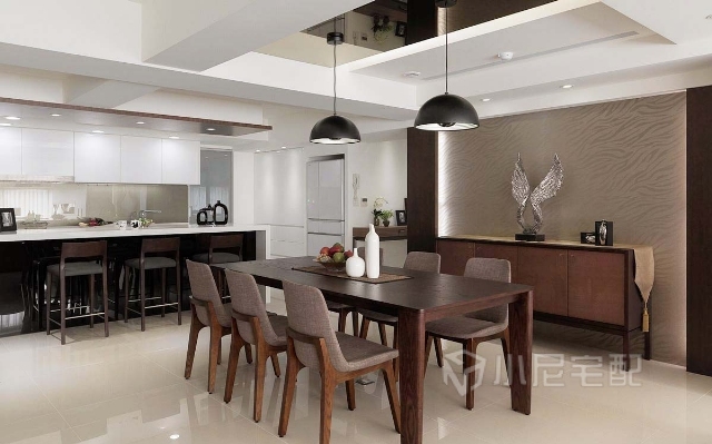開放式的空間,鏡面材質(zhì)的天花,黑色質(zhì)感的燈具,時尚利落的餐廳空間。