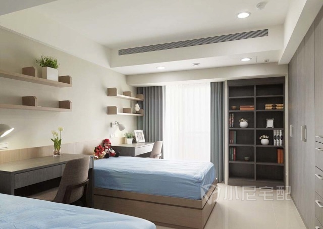 兩個男孩的房間,床頭都整合了各自的閱讀區(qū),床尾的衣柜后面是老人房,既可以收納又可以隔開兩個空間。