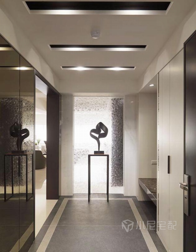 地板采用深色石材,墻面與天花構成一字線條,端景墻是用琉璃和石材鋪成的。