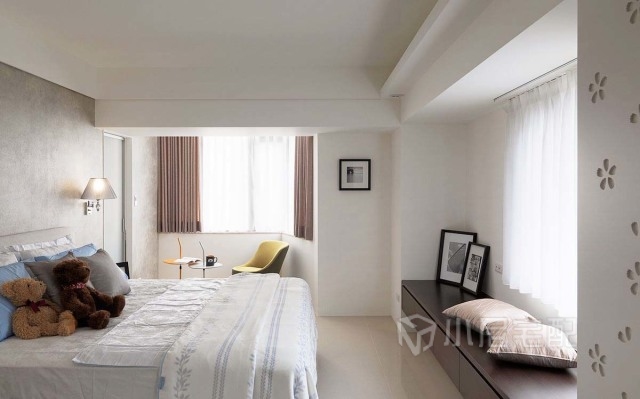 主臥干凈大氣,光線很好,特別開設了一個休息閱讀區(qū)。