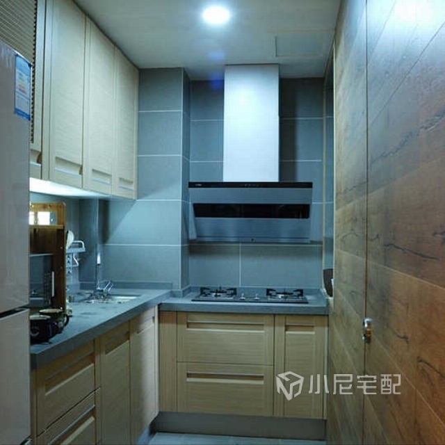 灰色啞光磚和木色門(mén)板無(wú)非是最舒服的搭配手法,廚房冷凍保鮮、洗、切、配、烹飪于一體,功能明確流暢。