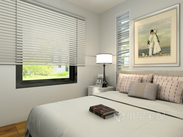 白色的卷簾,搭配白的雙人床,使臥房更加潔凈,且富有現(xiàn)代感。