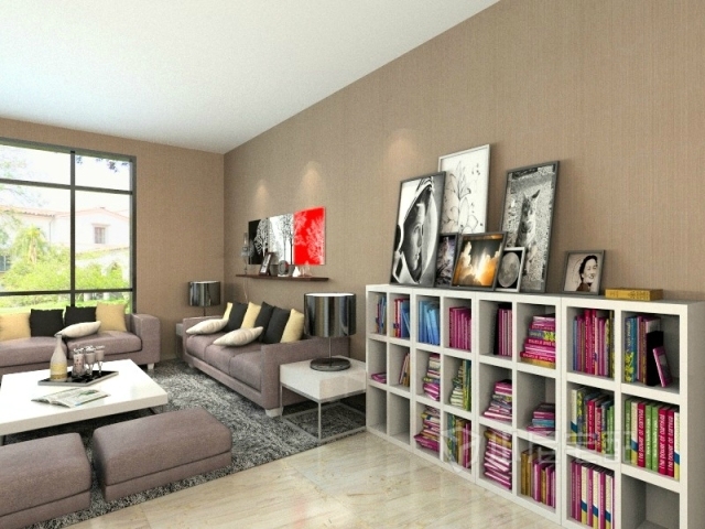 棕色背景墻加以白色瓷磚地面搭配彩色書架,色彩對比強(qiáng)烈又不失簡潔。