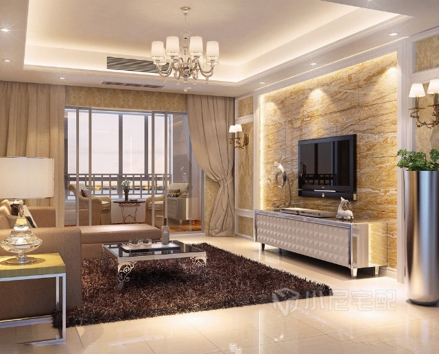 金屬感是設(shè)計(jì)這戶客廳的主題感覺。黃色豪麗,但不土。