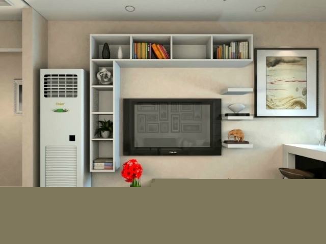 電視墻使用柜子,客廳雖小但儲物空間足夠,格架和板架可放置不同物品,同時(shí)避免造型過于單一。