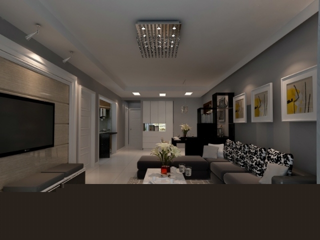客廳鋪設(shè)淺色地磚,選用深色家具穩(wěn)定空間。
