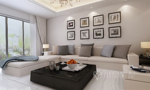 白色的沙發(fā),黑色的茶幾使整個客廳顯得沉穩(wěn)大氣,個性的裝飾畫與整個空間融合統(tǒng)一。