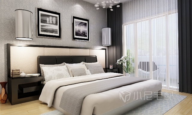 實木的床頭柜,皮質(zhì)的床頭,金屬感的燈具,多樣的材質(zhì)使臥室更加豐富。