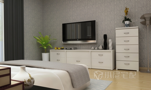白色現(xiàn)代的電視柜與床相搭配,多層屜柜增加了臥室的儲物功能。
