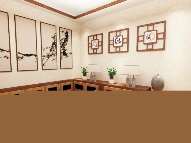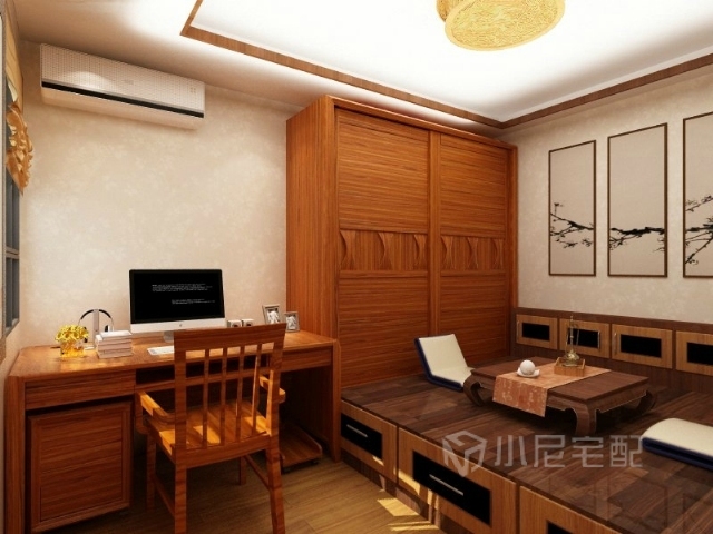 布置中式榻榻米,既可做書房又可做臥室,還可做茶室,水墨畫和木質框架畫框營造書房雅致,家居的顏色也偏重一些,突出書房安靜穩(wěn)重的氣氛,使生活的實用性和對傳統(tǒng)文化的追求同時得到了滿足。