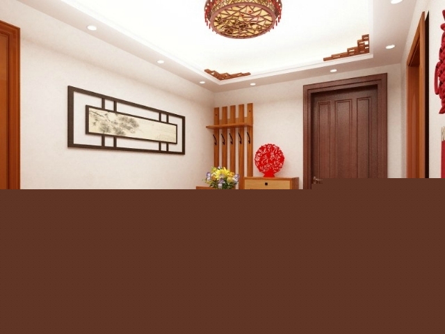 餐廳:使用木材家具,更烘托家居生活的溫馨,避免了現(xiàn)代家居帶來的冰冷感,同時營造中式氛圍。入門處鞋柜用鏤空做裝飾,原木色調與室內家具統(tǒng)一,擺設采用紅色的中式元素。
