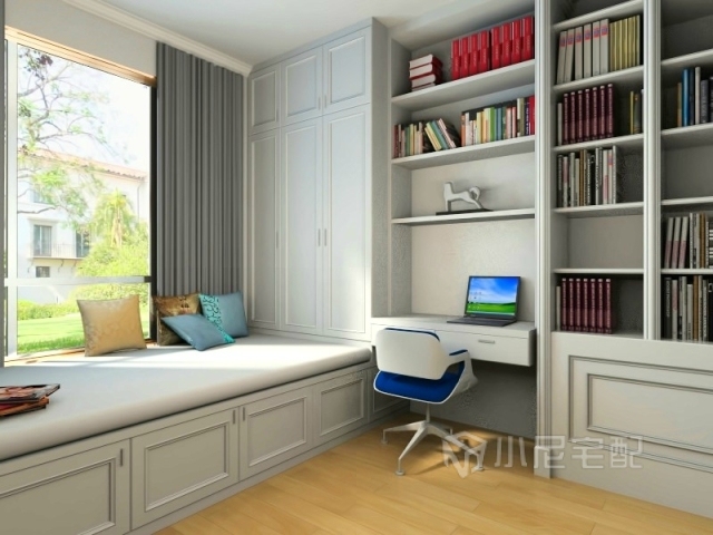 書(shū)房看起來(lái)整個(gè)空間簡(jiǎn)單、舒適,書(shū)架的空間足夠容納下主人所有的書(shū)籍。整個(gè)立體形式都與有條不紊的、有節(jié)奏的曲線融為一體。以簡(jiǎn)潔的造型、完美的細(xì)節(jié),營(yíng)造出時(shí)尚前衛(wèi)的感覺(jué)。