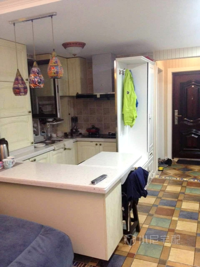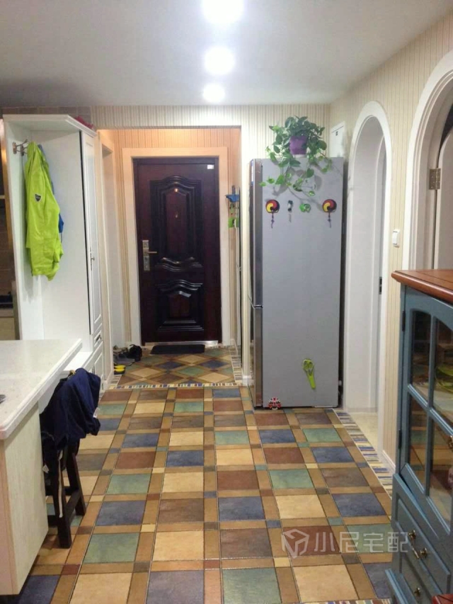 入戶位置,地面菱形鋪貼,配合彩色波打線,頂部石膏線和地中海風情吸頂燈。