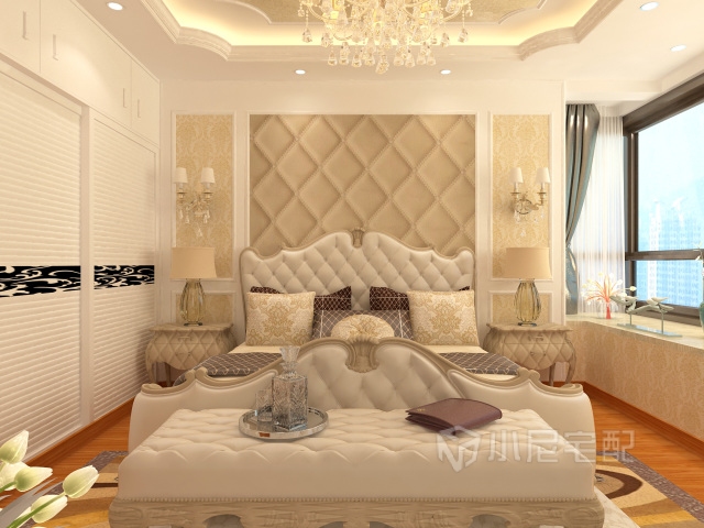 主臥室背景墻用軟包和壁布搭配,配飾壁燈如果到了晚上別有一番情調(diào)