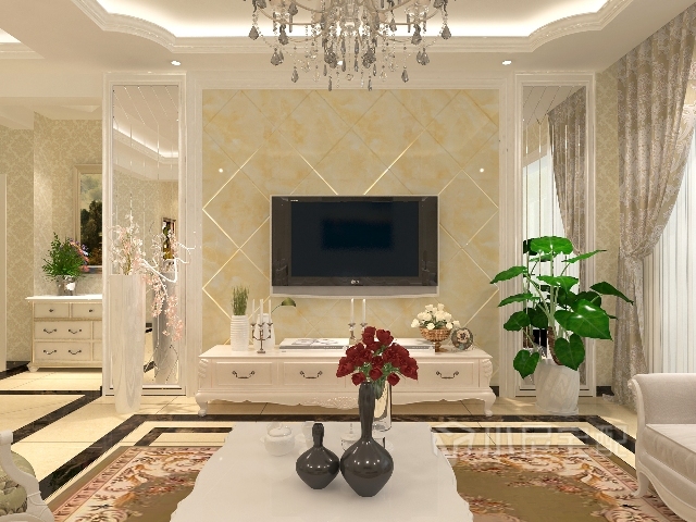 電視背景墻以暖色墻磚和白調(diào)鏡面搭配,給人以舒適溫馨之感