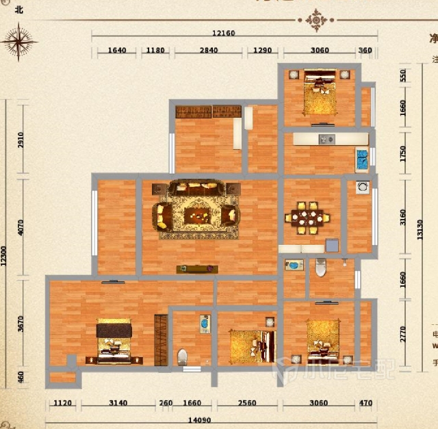 餐廳區(qū),利用波打線和其他功能區(qū)進(jìn)行分割。同樣以暖色調(diào)突出餐廳區(qū)域