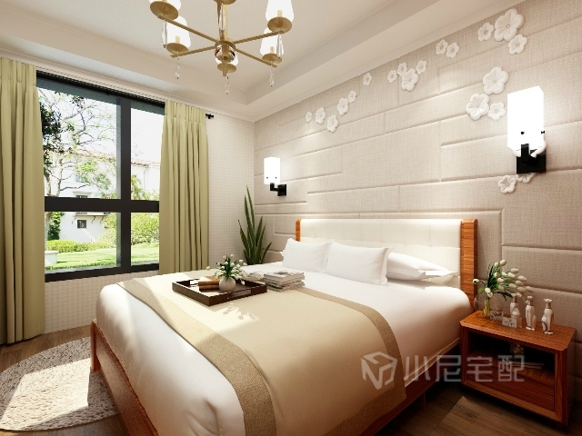 軟包的臥室背景墻簡(jiǎn)約時(shí)尚,配以白色的五角梅的點(diǎn)綴,增加一份恬靜。淡綠色的窗簾與黃金柚木的家具結(jié)合增加了自然的氣息。