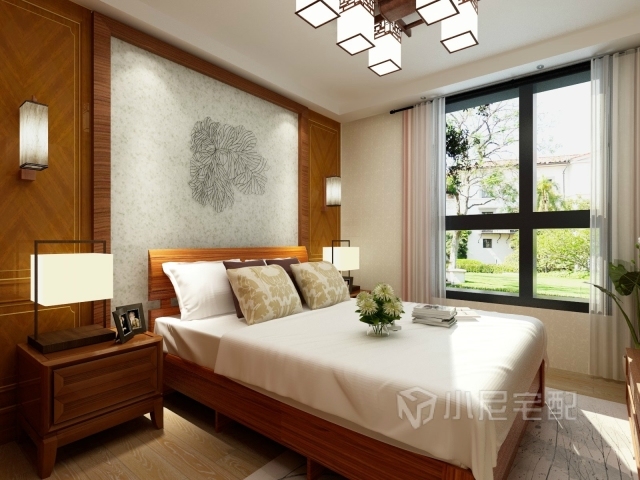 臥室背景墻選用與床顏色相近的木飾面板,使整個(gè)空間融為一體,顯得沉穩(wěn)大氣