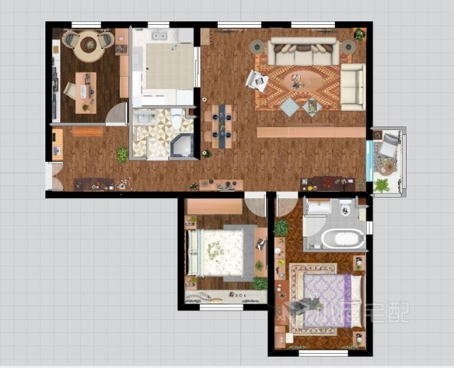 客餐廳有兩扇大窗戶,使室內(nèi)空間光線充足明亮,選用金絲胡桃的家具搭配白色軟裝,烘托出整個家的溫馨氛圍。