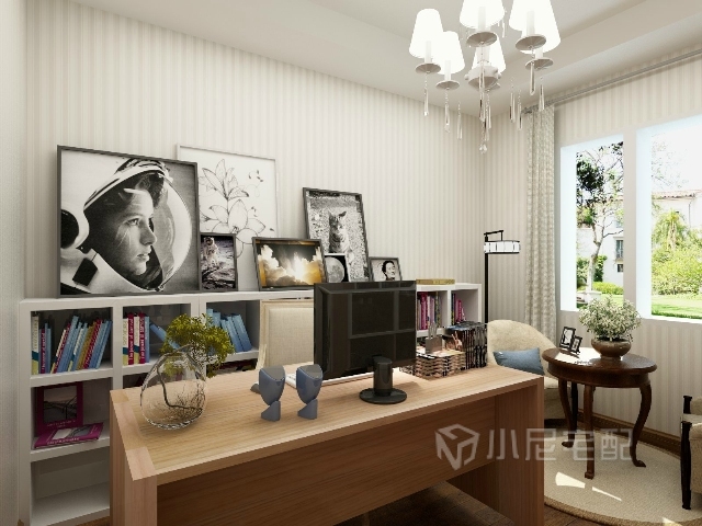 素色的條紋壁紙,窗前的休閑桌椅,多幅大小不一的裝飾畫,打造一個現(xiàn)代的舒適的書房。