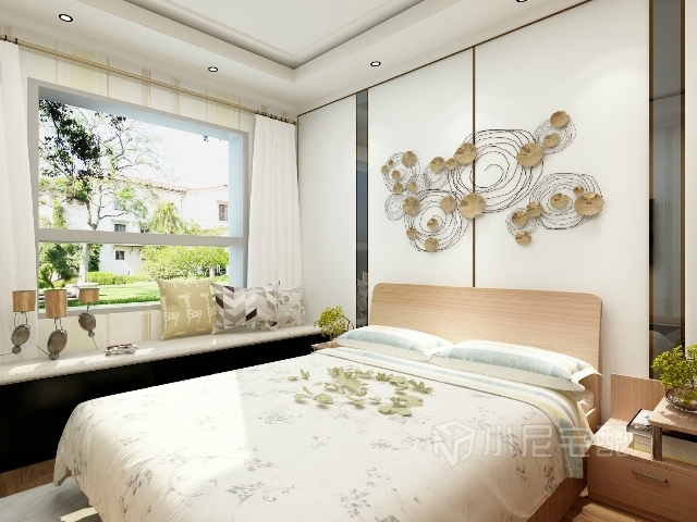 飄窗柜的設(shè)計增加了臥室的儲物功能,加上軟墊和抱枕,閑暇時坐在窗前也是一種享受。
