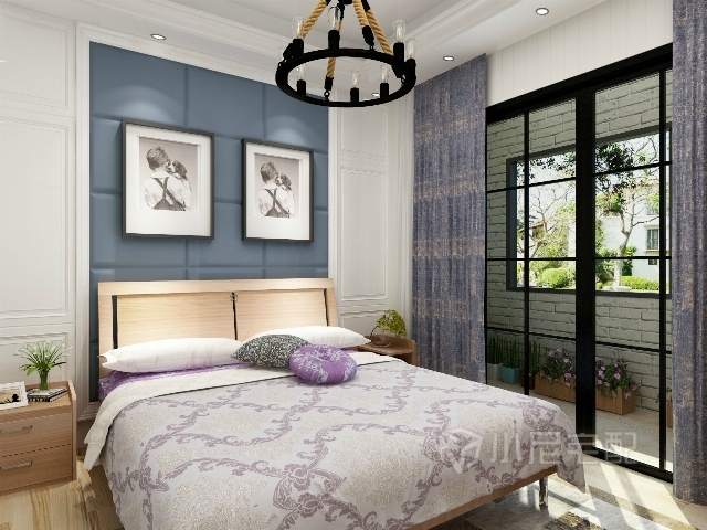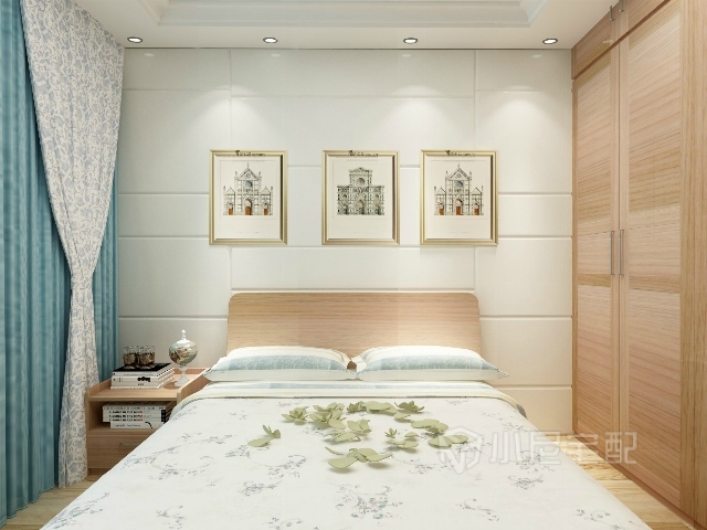 色彩和客廳呼應(yīng)的淡藍(lán)色的背景墻,顯得不那么生硬,使臥室空間顯得柔軟舒適。