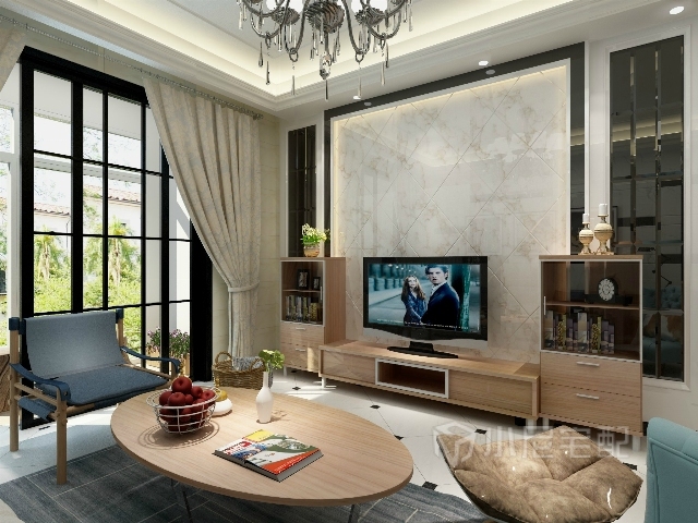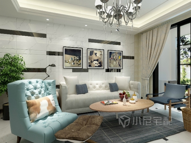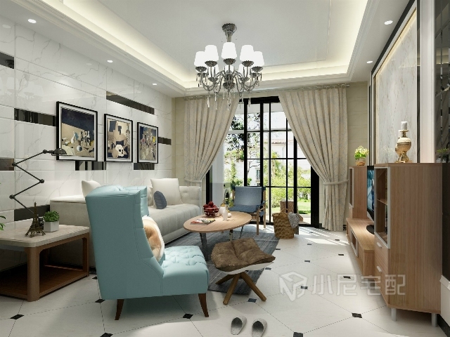 從另一個(gè)角度觀賞客廳,采光十分充足,窗簾采用了淺色調(diào)來搭配,乳白色的窗簾搭配藍(lán)色的單人沙發(fā),微風(fēng)吹過,感覺就像帶著淺淺的海洋氣息。