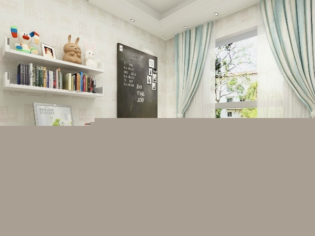 兒童房的設(shè)計(jì)一個(gè)榻榻米,節(jié)約空間,小書桌,書架,小黑板營造一個(gè)功能齊全,學(xué)習(xí)加休閑的空間,利于孩子的成長。