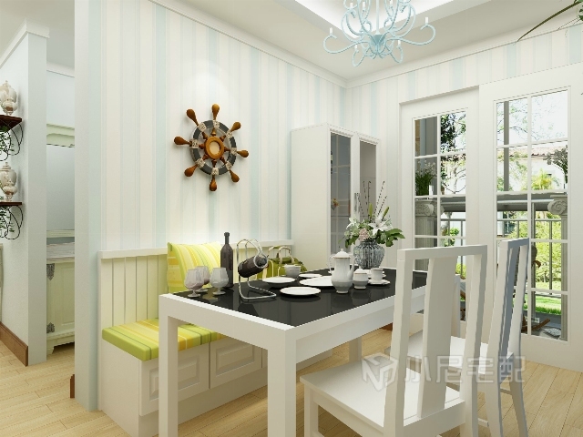 融入鮮艷的綠色,給人視覺的新意。墻上的地中海掛件,藍(lán)色的壁紙,給人清涼自然的感覺。