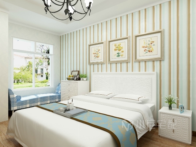 白色的波浪紋的床頭,黃色裝飾畫,淡綠色條紋壁紙,藍(lán)色格子的軟塌,搭配出最舒適的組合。