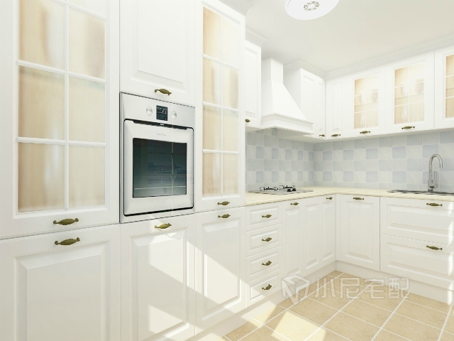白色的櫥柜組合,藍(lán)白格子的墻磚,清新整潔,功能強(qiáng)大。