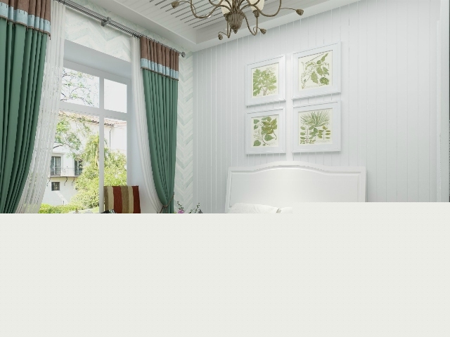綠色的窗簾,白色的背景墻,綠植裝飾畫,營造自然清新的環(huán)境。