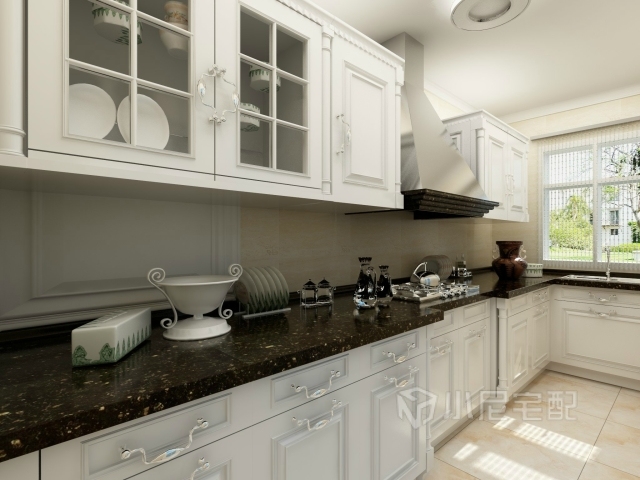 白色歐式櫥柜,黑色的石英石臺面耐臟耐磨。