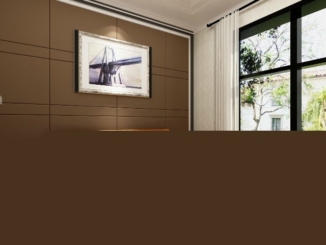 深棕色的背景墻顯得沉穩(wěn)大氣,潔白的窗簾和床單,干凈整潔。