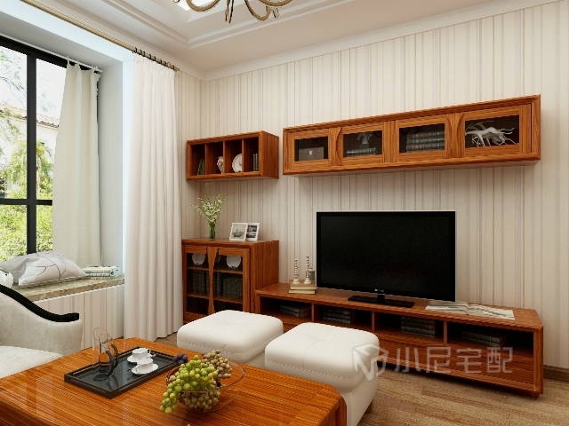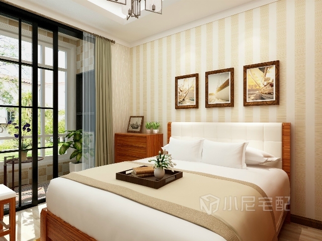 潔白的窗簾,條紋壁紙,搭配色彩較亮的家具,冷暖結(jié)合,溫馨舒適。