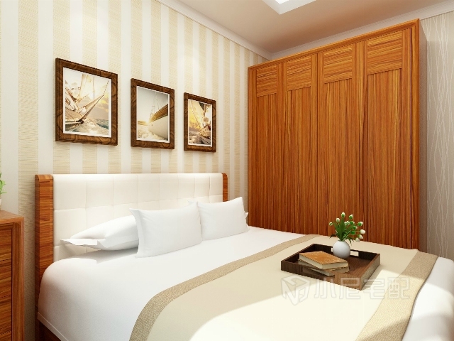 舒適的軟包床頭,淡黃色條紋壁紙,打造溫馨舒適的休息空間。