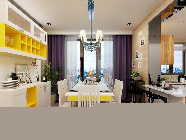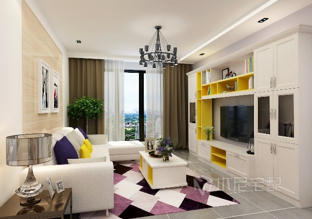 利用黃色和紫色為互補(bǔ)色,用紫色的抱枕和地毯做為點(diǎn)綴,活潑而不失優(yōu)雅。