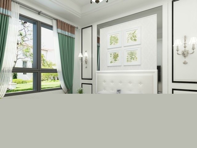 簡潔造型的背景墻,綠色的窗簾與綠葉的裝飾畫相呼應。