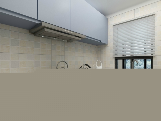 淡藍的的櫥柜組合,搭配暖色的墻磚,冷暖結(jié)合,溫馨宜人。