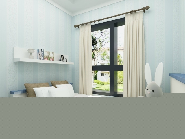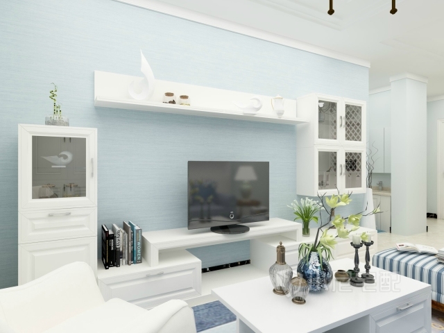 淡淡的藍色的背景墻與白色簡潔的電視柜搭配,清新柔和。