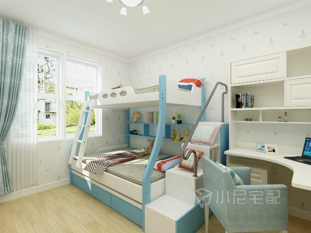 藍色的高低兒童床,轉角書桌,適合活潑好動的孩子。
