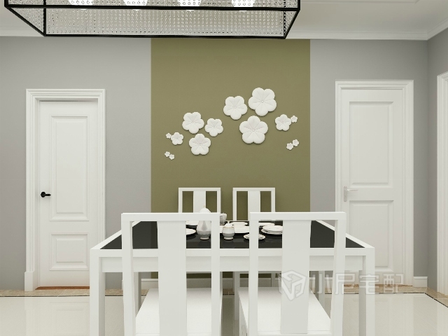 墨綠色的背景墻,白色的梅花裝飾,大方優(yōu)雅。